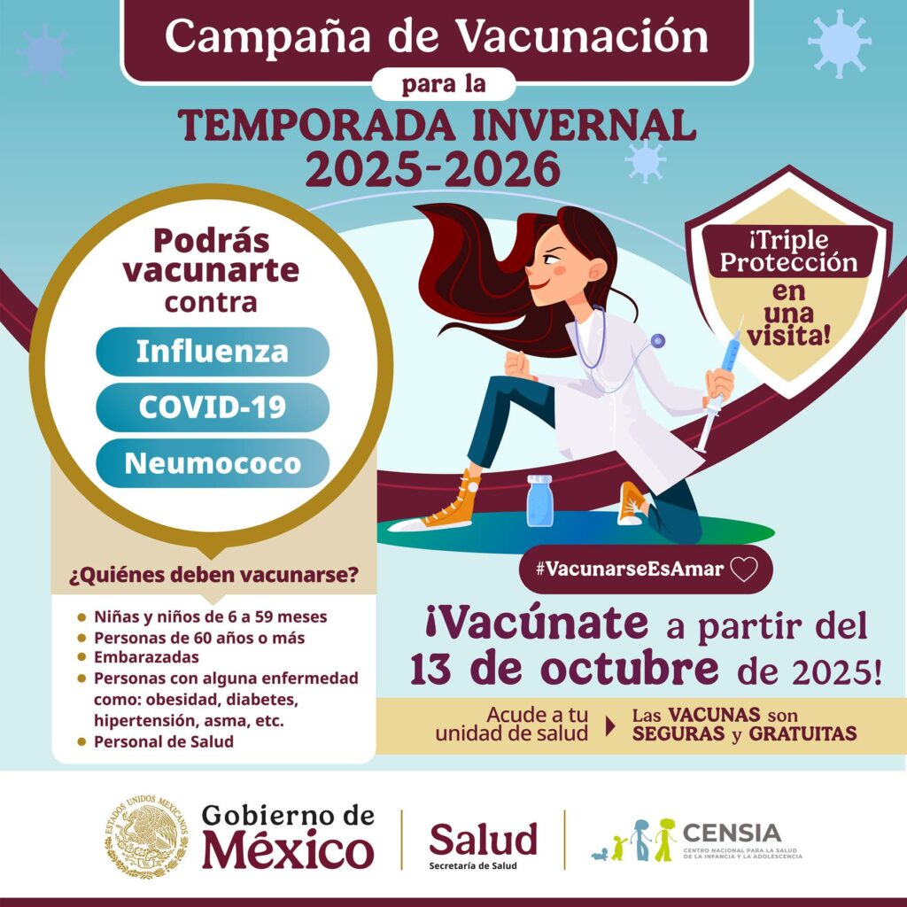 Para la aplicación de estas vacunas, debes acudir a tu unidad médica familiar más cercana o a las brigadas de vacunación que estarán cercas de tu colonia, a partir del 13 de octubre 2025 al 3 de abril de 2026.